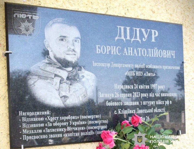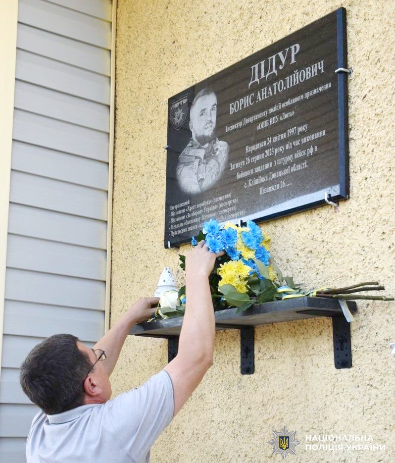 26-річний Борис Дідур загинув 26 серпня 2023 року під час виконання бойового завдання поблизу Бахмут. Її встановили на адмінприміщенні територіального підрозділу поліцію, в якому полеглий захисник працював інспектором з ювенальної превенції.