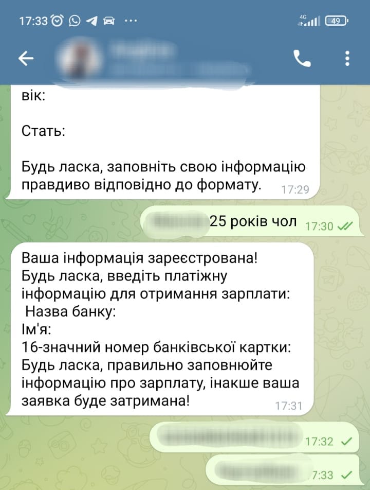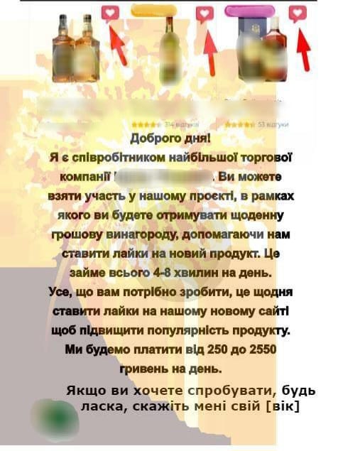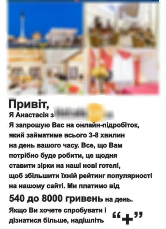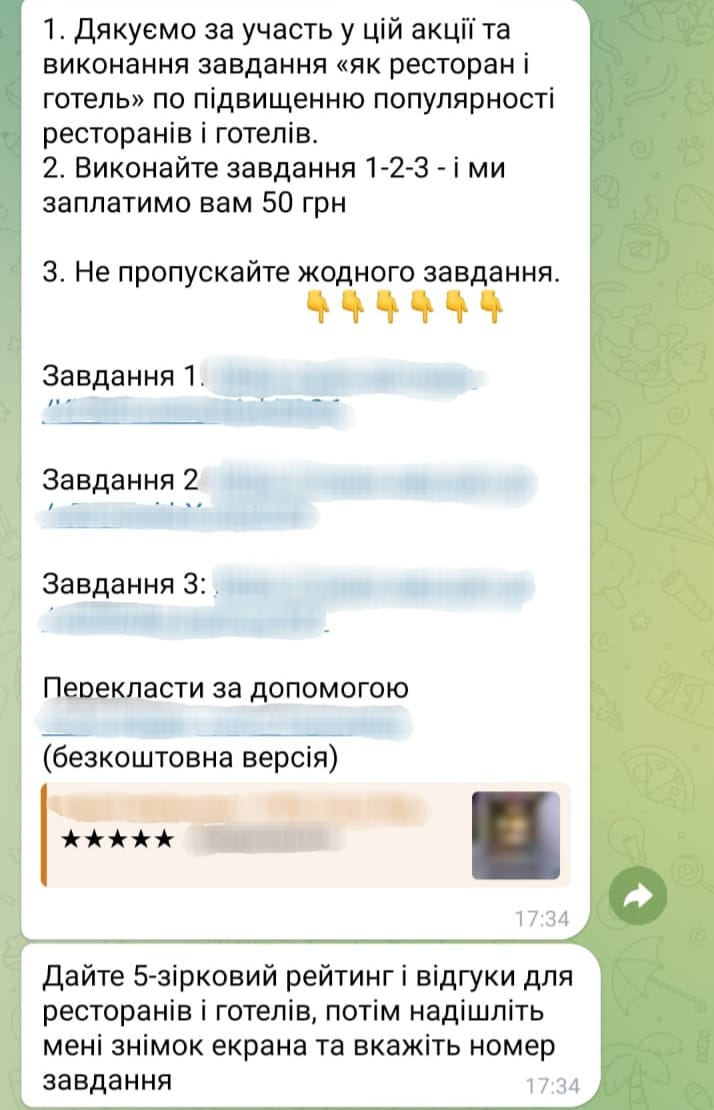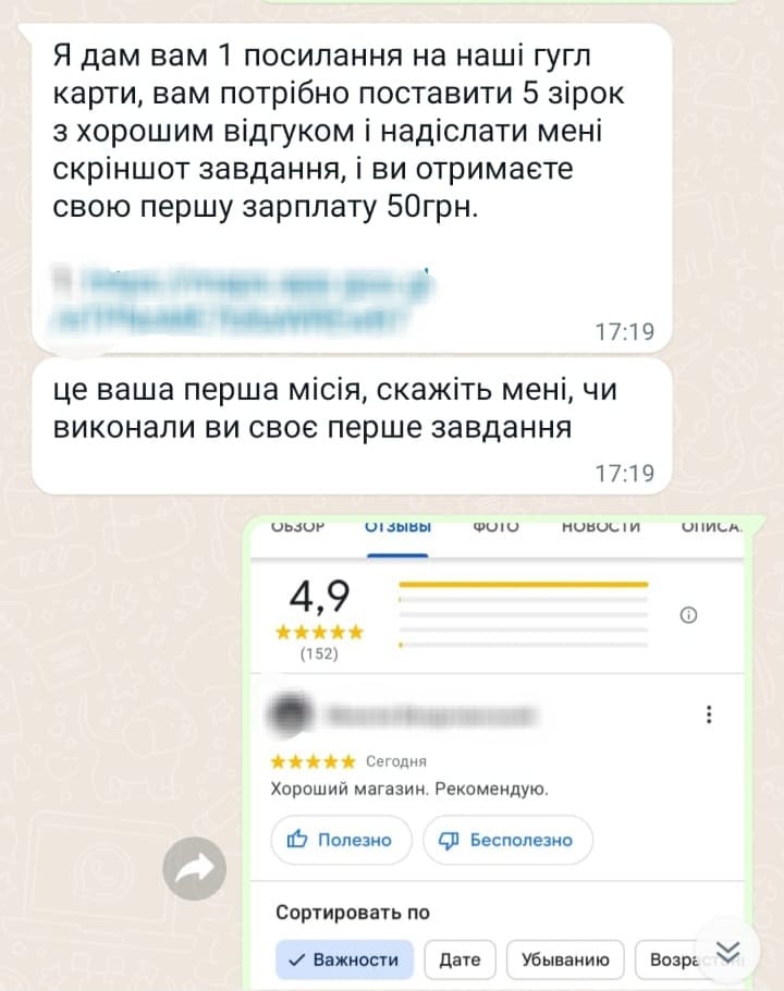 - Шахраї розсилають повідомлення приблизного змісту: «Наша фірма співпрацює з найкращими цифровими компаніями, які готові платити за підвищення свого рейтингу. Робота проста – вам потрібно оцінити та залишити відгук про наші ресторани, готелі, магазини. Ми ПЛАТИМО 50 гривень за 1 тестове завдання, а ви можете заробити до 1500-3000 грн в день. Якщо хочете дізнатись більше, надсилайте +»;