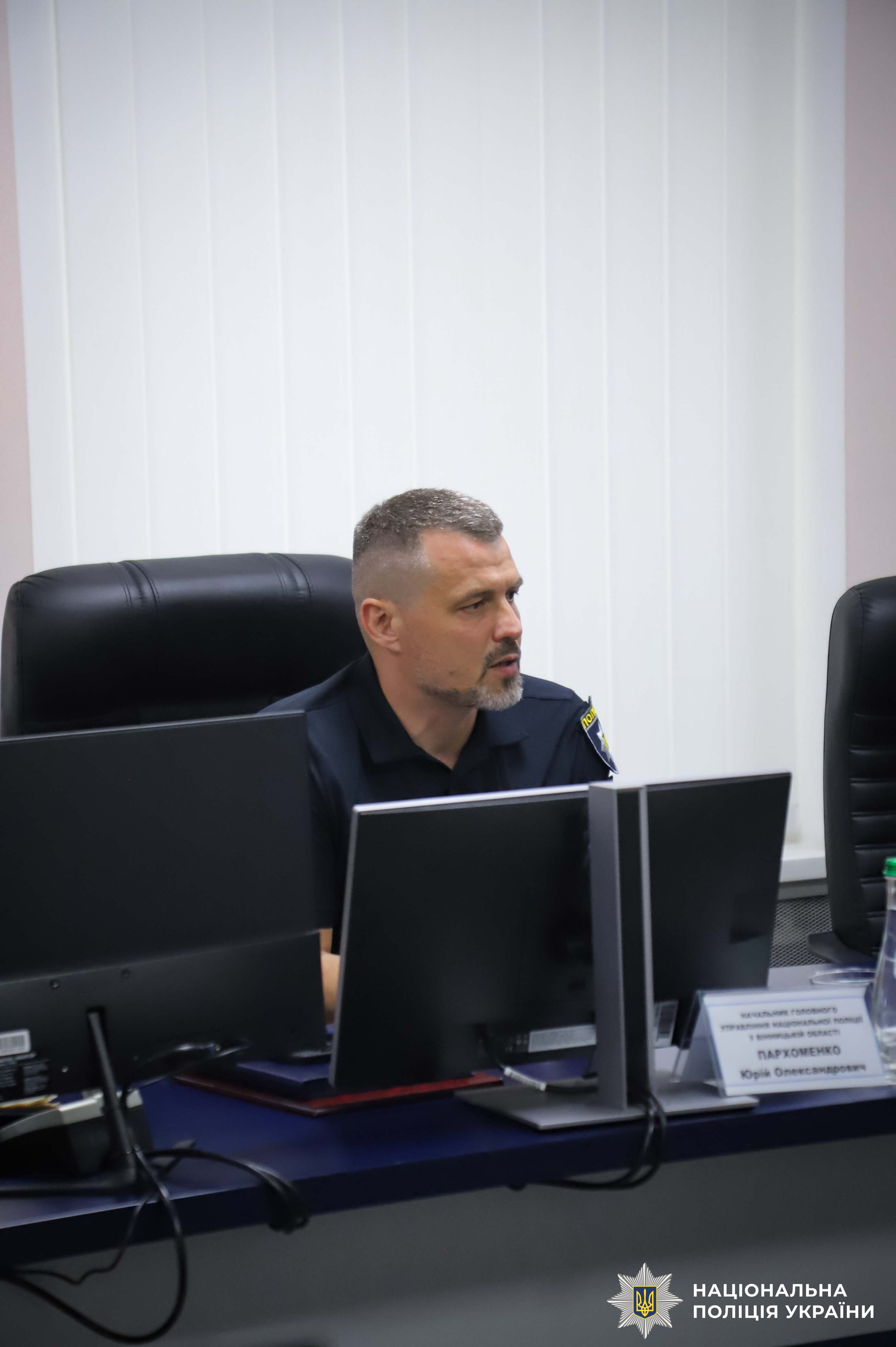 Юрій Пархоменко довів присутнім, що в умовах воєнного стану поліцейські Вінниччини працюють в посиленому варіанті несення служби, спільно з іншими силами безпеки і оборони забезпечують правопорядок на території області.