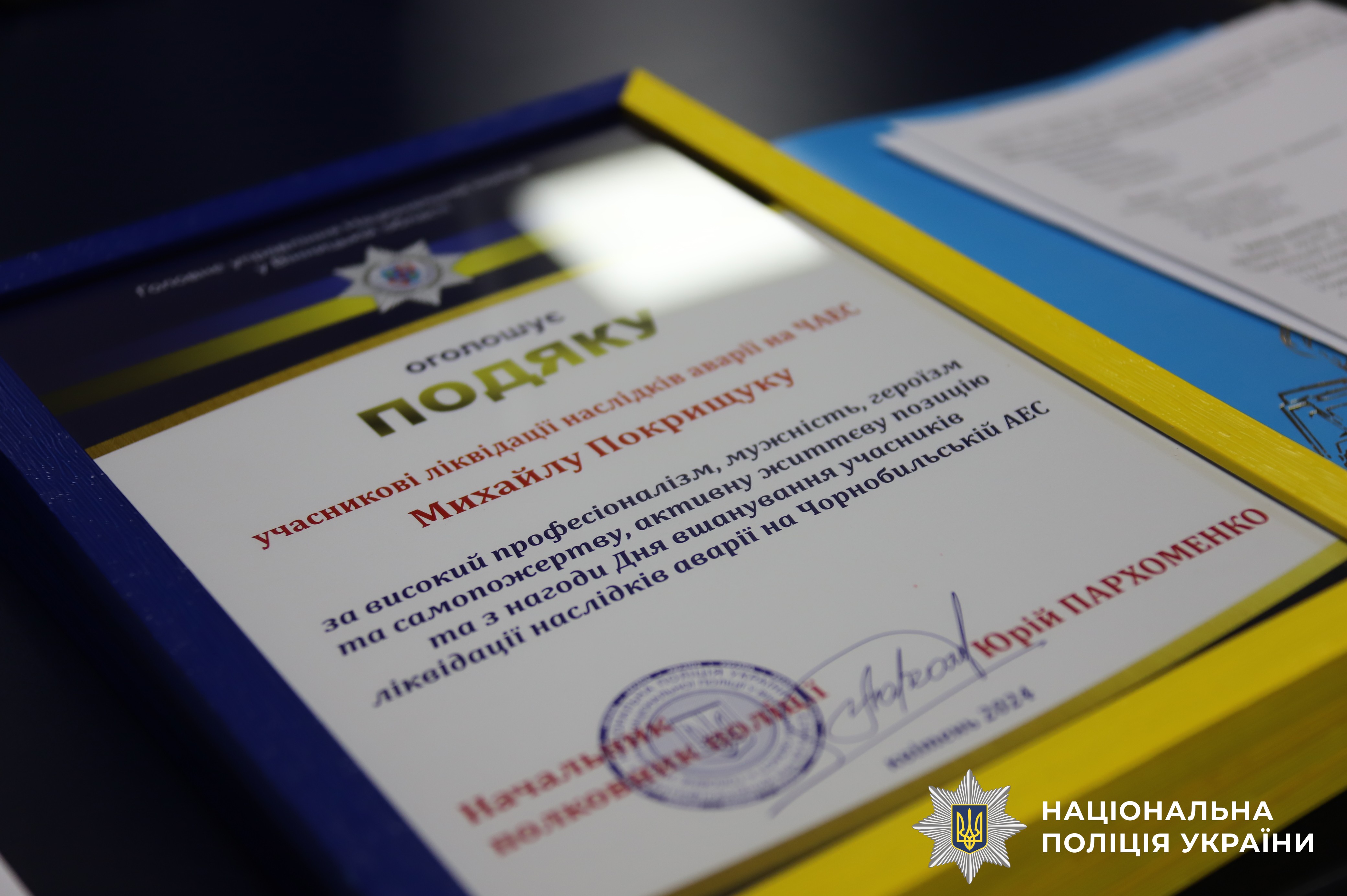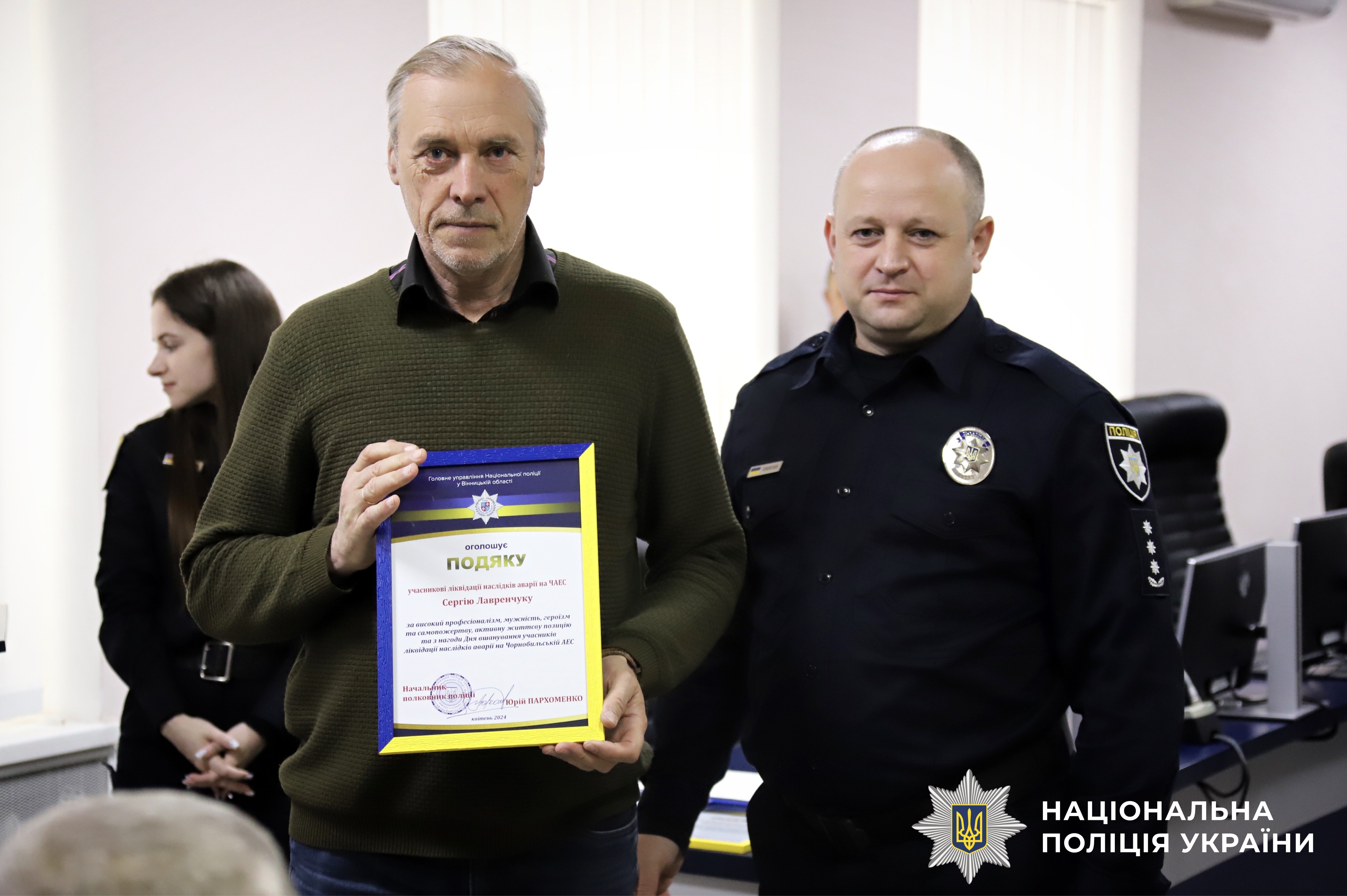 Сьогодні, з нагоди відзначення 38-ї річниці Чорнобильської катастрофи у Головному управлінні Нацполіції Вінниччини заступник начальника Володимир Олексюк відзначив ветеранів-ліквідаторів, які мужньо виконували свій професійний обов’язок та врятували світ від радіаційної загрози.