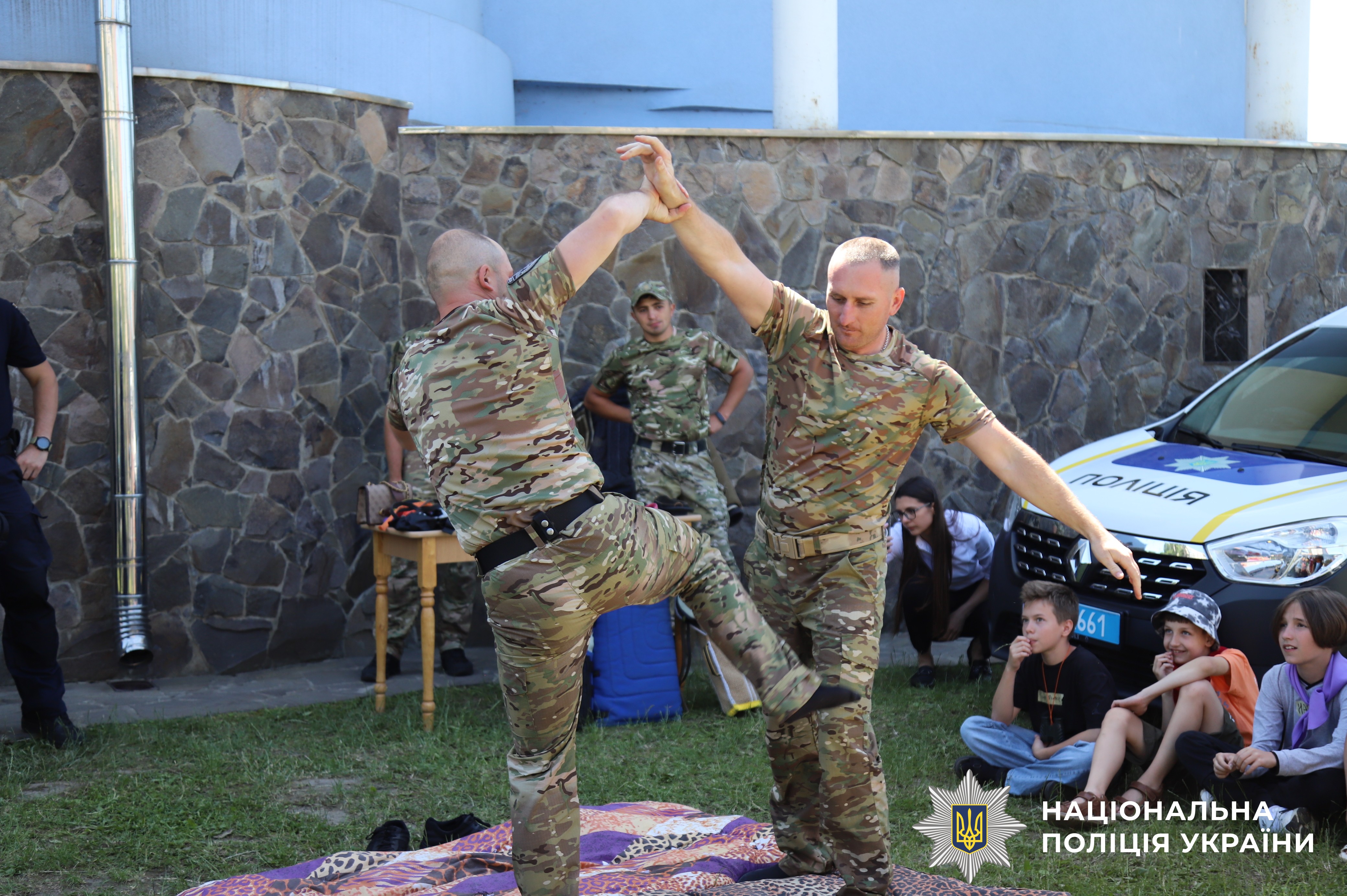 Батальйон поліції особливого призначення ознайомив дітей з різними видами індивідуальних засобів захисту, такими як бронежилети та шоломи. Поліцейські також продемонстрували прийоми рукопашного бою, що викликало великий інтерес у юних глядачів.