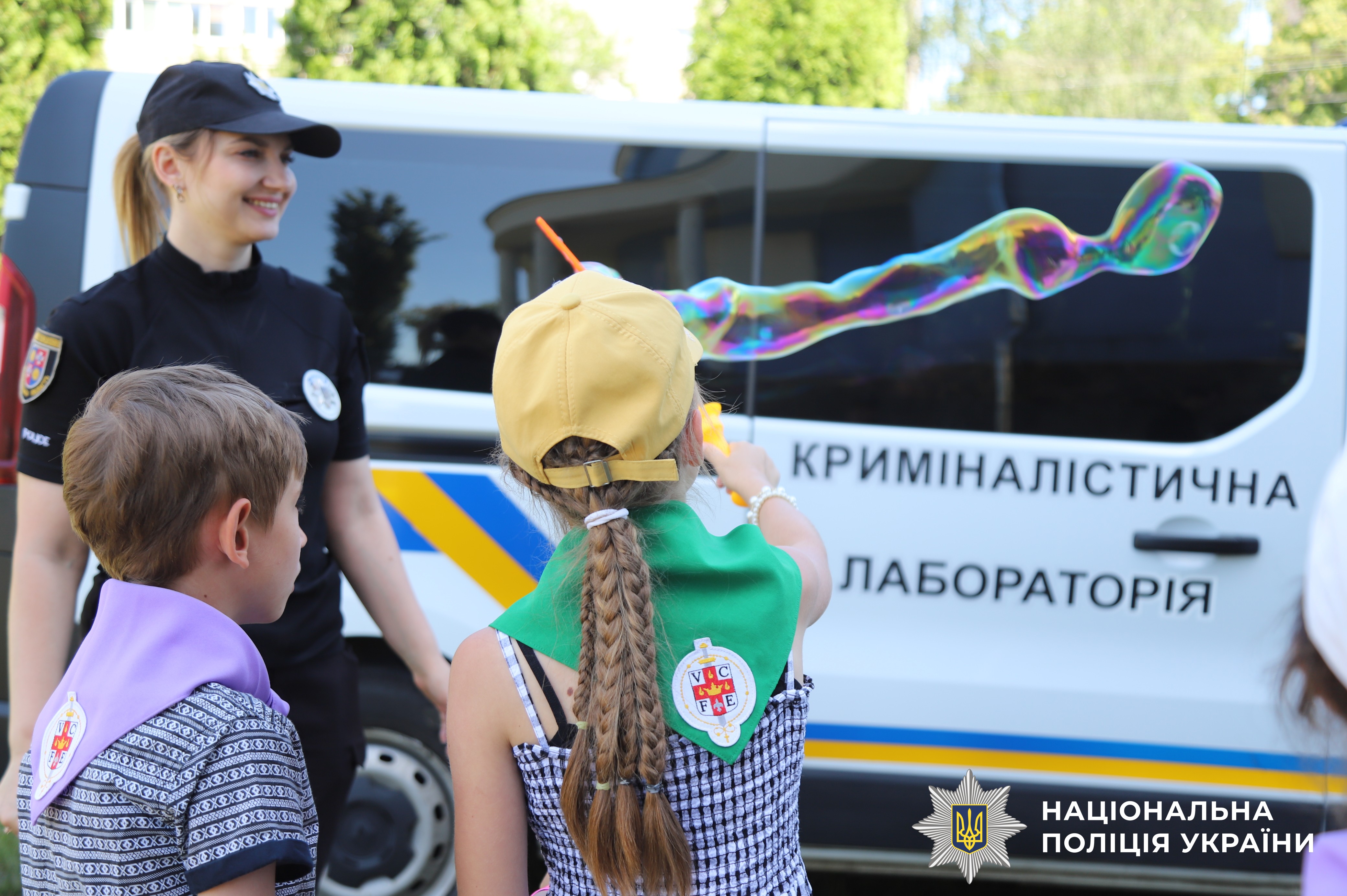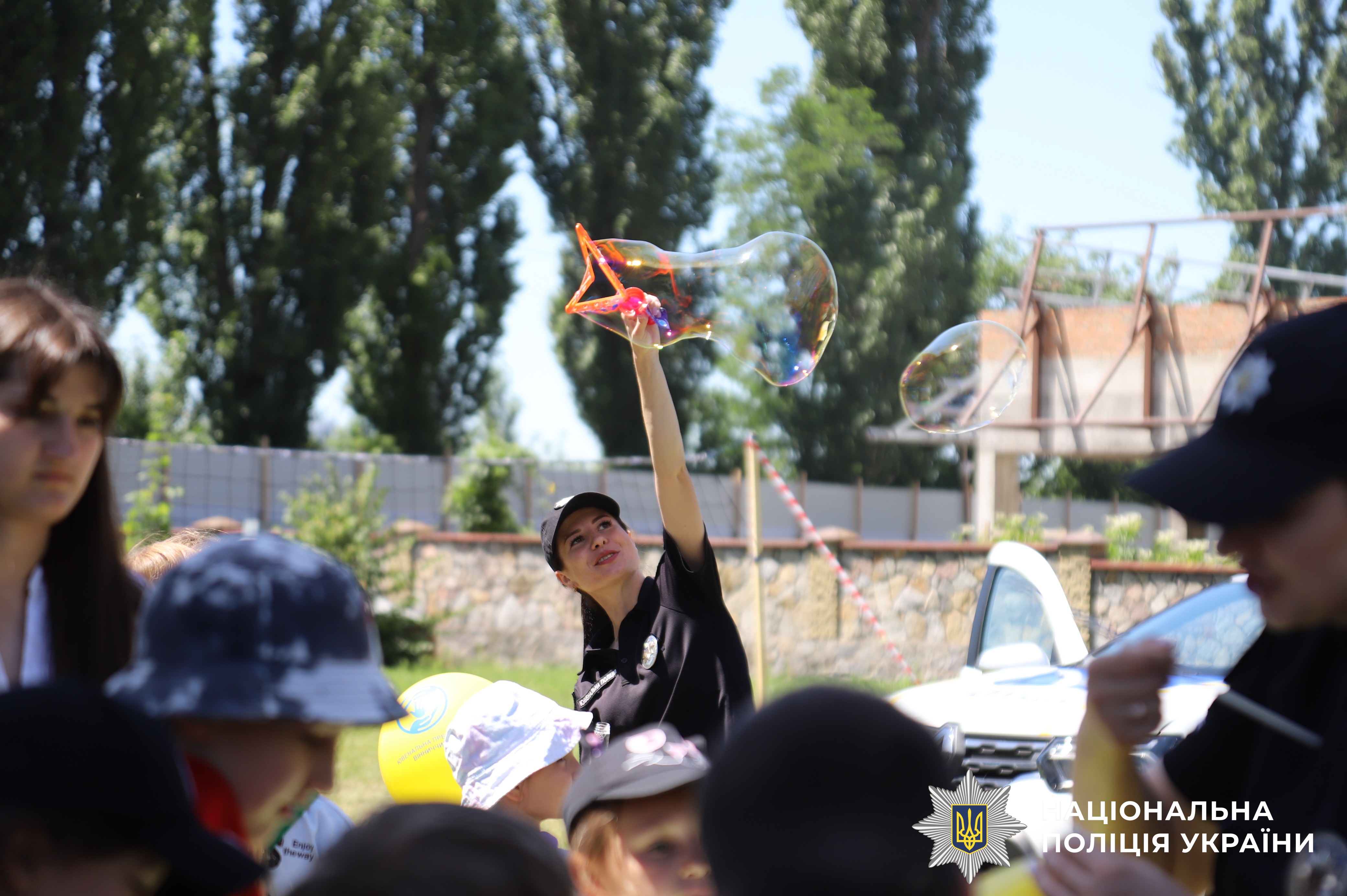 Після офіційної частини заходу діти весело провели час, пускаючи мильні бульбашки та розважаючись у службовому автомобілі. Вони сиділи за кермом, вмикали спецсигал і навіть поговорити у поліцейський мікрофон.