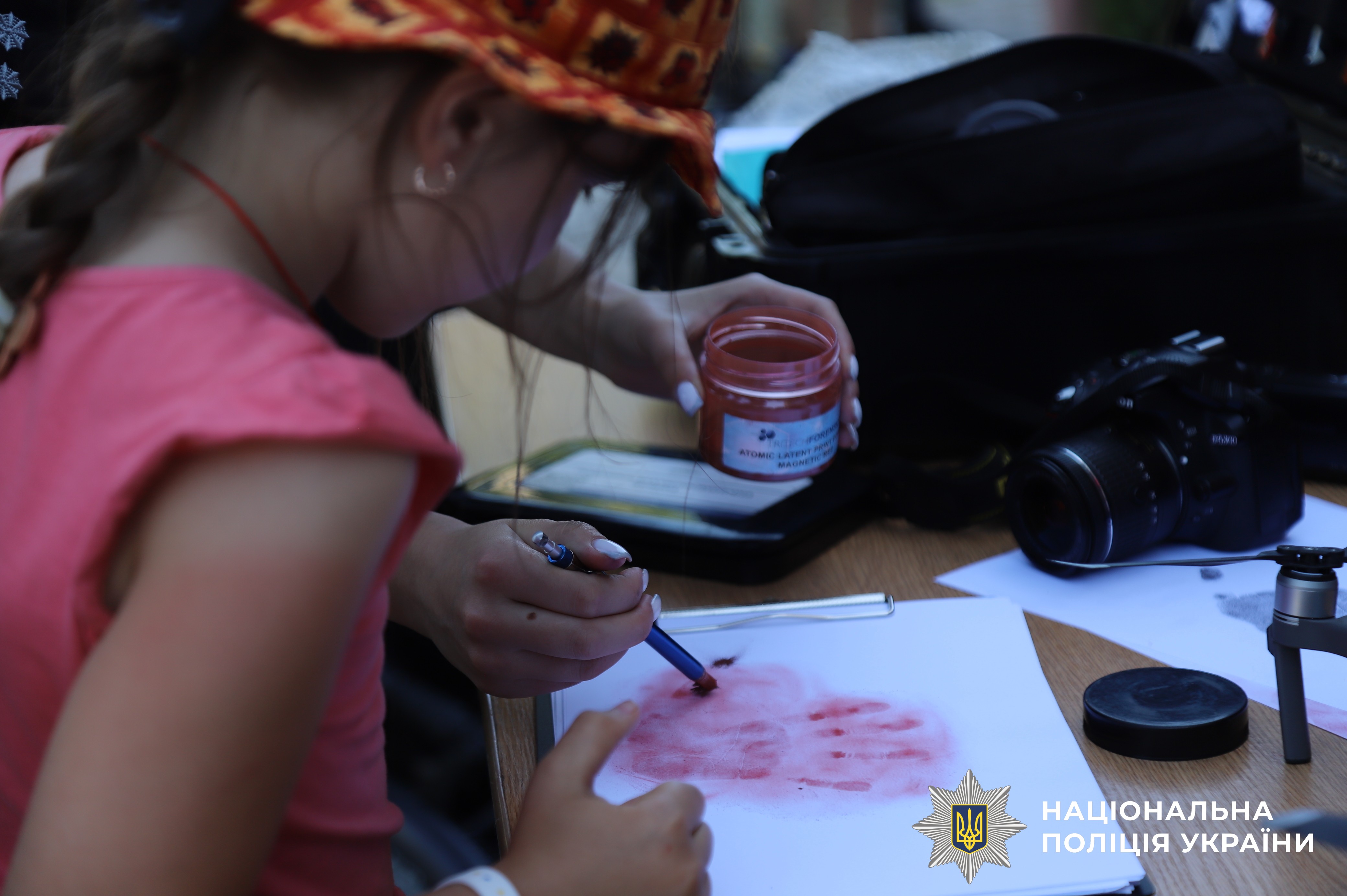 Криміналісти продемонстрували свою криміналістичну валізу, яка містила різноманітні інструменти для розслідування злочинів. Вони показали дітям, як збирати відбитки пальців, і навіть дозволили спробувати зробити це самостійно. Діти були вражені коли побачили, як відбитки пальців з'являються на папері.