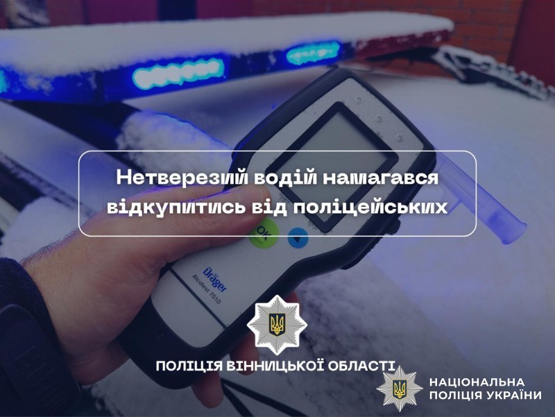 Цього ж дня, в одному із сіл Барської територіальної громади правоохоронці також виявили ознаки алкогольного сп’яніння у 56-річного керманича легковика ВАЗ. Результат освідування чоловіка показав 0,7 проміле алкоголю в організмі. За непритягнення до адміністративної відповідальності чоловік запропонував поліцейським неправомірну вигоду в розмірі 10 тисяч гривень.